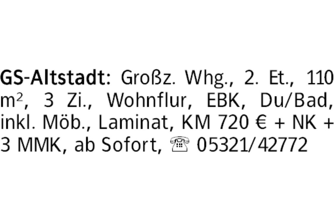 GS-Altstadt: Großz. Whg., 2. Et., 110 m², 3 Zi., Wohnflur, EBK, Du/Bad, inkl. Möb., Laminat, KM 720 € + NK + 3 MMK, ab Sofort, 05321/42772