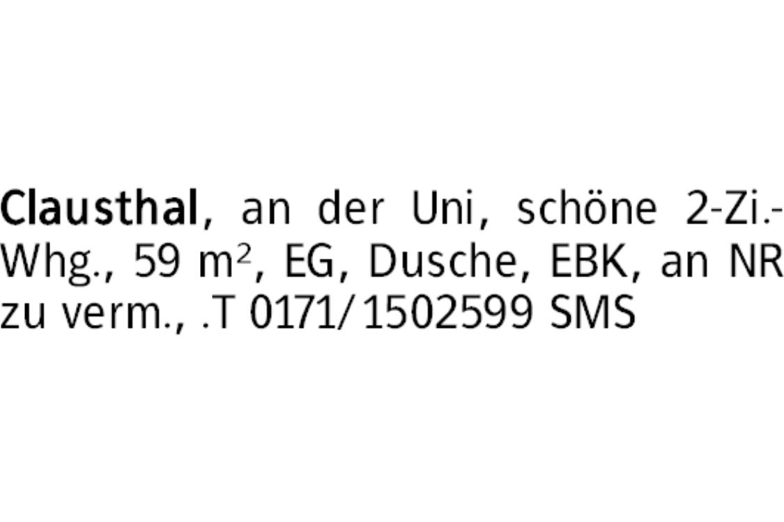 Clausthal, an der Uni, schöne 2-Zi.-Whg., 59 m², EG, Dusche, EBK, an NR zu verm., .T 0171/1502599 SMS