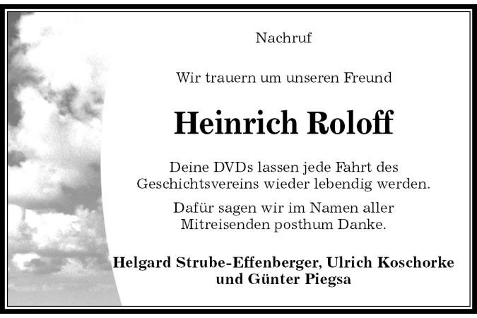 Nachruf Heinrich Roloff Helgard Strube-Effenberger, Ulrich Koschorke und Günter Piegsa Wir trauern um unseren FreundDeine DVDs lassen jede Fahrt des Geschichtsvereins wieder lebendig werden.Dafür sagen wir im Namen allerMitreisenden posthum Danke.