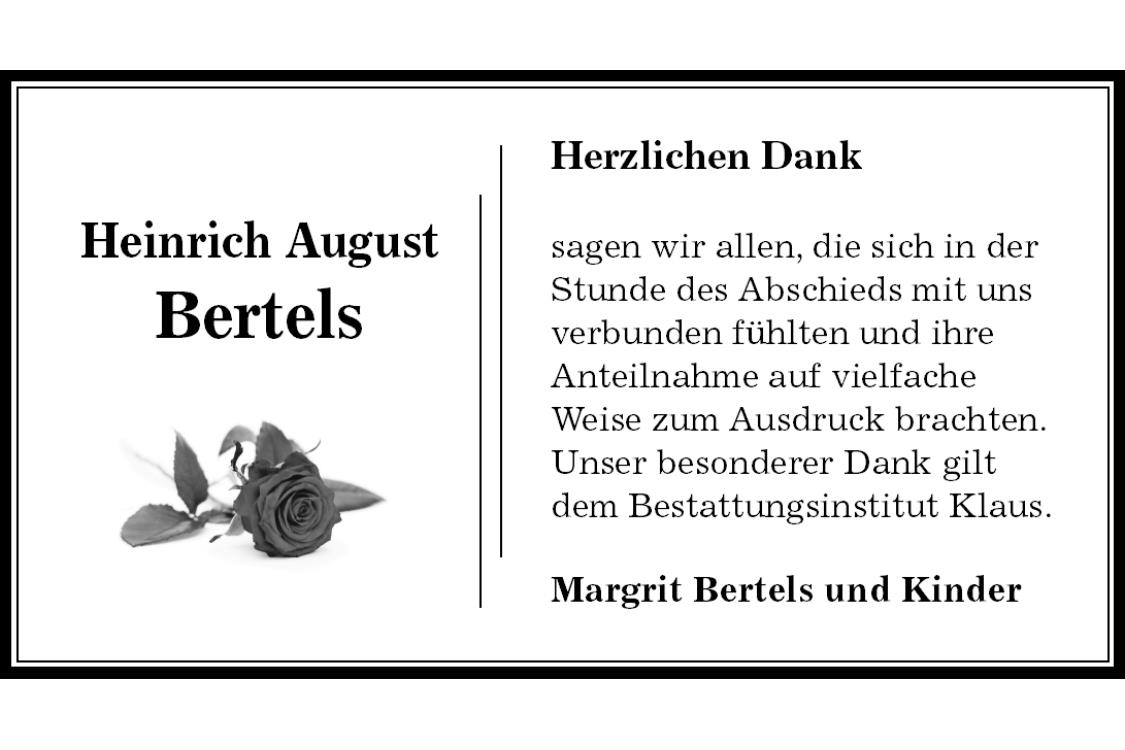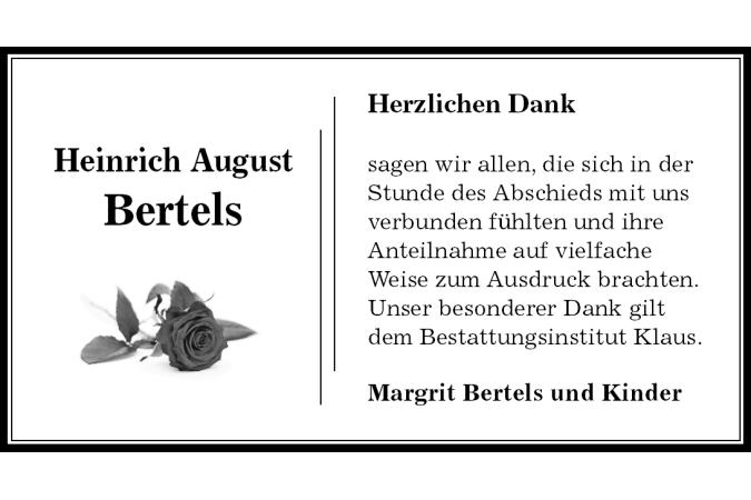 Herzlichen Dank Margrit Bertels und Kinder Heinrich AugustBertels sagen wir allen, die sich in der Stunde des Abschieds mit uns verbunden fühlten und ihre Anteilnahme auf vielfacheWeise zum Ausdruck brachten.Unser besonderer Dank gilt dem Bestattungsinstitut Klaus.