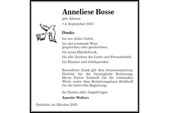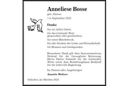 Anneliese Bosse † 4. September 2025Im Namen aller Angehörigen Annette WoltersOstlutter, im Oktober 2025 für ein stilles Gebet, für das tröstende Wort, gesprochen oder geschrieben, für einen Händedruck, für alle Zeichen der Liebe und Freundschaft, für Blumen und Geldspenden. Besonderer Dank gilt dem Seniorenzentrum Neiletal für die fürsorgliche Betreuung, Herrn Pastor Schmidt für die tröstenden Worte sowie dem Bestattungshaus Berkhoff für die liebevolle Begleitung. Danke geb. Ahrens
