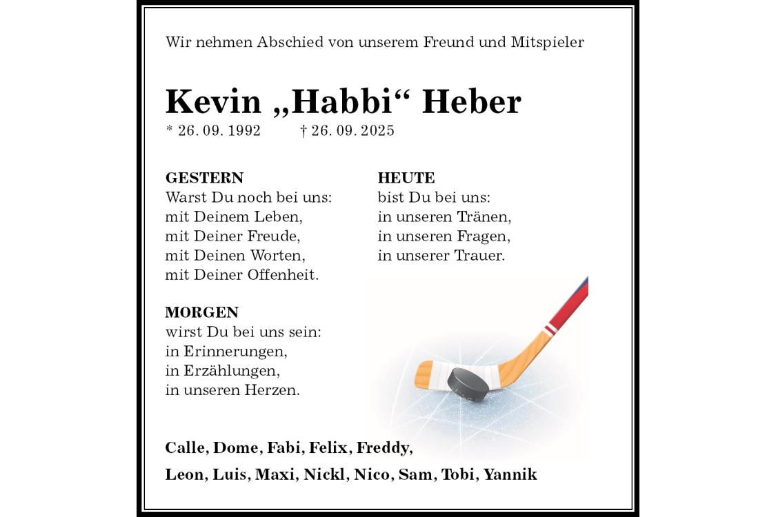 Wir nehmen Abschied von unserem Freund und Mitspieler Kevin „Habbi“ Heber * 26. 09. 1992 † 26. 09. 2025 Calle, Dome, Fabi, Felix, Freddy,Leon, Luis, Maxi, Nickl, Nico, Sam, Tobi, Yannik GESTERN HEUTE Warst Du noch bei uns: bist Du bei uns: mit Deinem Leben,in unseren Tränen, mit Deiner Freude, in unseren Fragen, mit Deinen Worten,in unserer Trauer. mit Deiner Offenheit. MORGEN wirst Du bei uns sein: in Erinnerungen, in Erzählungen, in unseren Herzen.