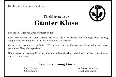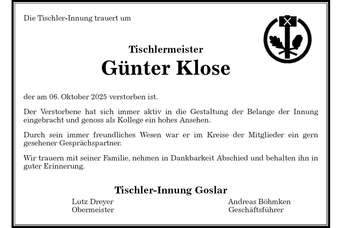 Die Tischler-Innung trauert um TischlermeisterGünter Klose Tischler-Innung Goslar Lutz Dreyer Andreas Böhmken Obermeister Geschäftsführerder am 06. Oktober 2025 verstorben ist. Der Verstorbene hat sich immer aktiv in die Gestaltung der Belange der Innung eingebracht und genoss als Kollege ein hohes Ansehen. Durch sein immer freundliches Wesen war er im Kreise der Mitglieder ein gern gesehener Gesprächspartner. Wir trauern mit seiner Familie, nehmen in Dankbarkeit Abschied und behalten ihn in guter Erinnerung.