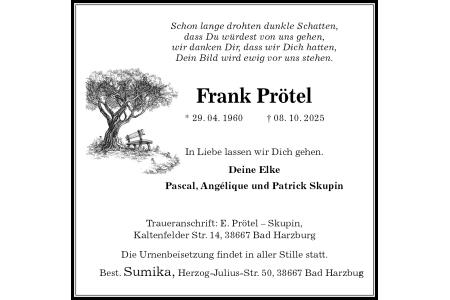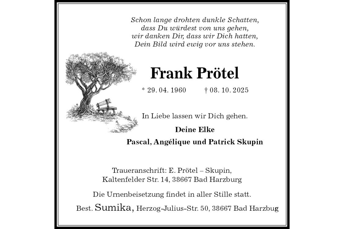 Schon lange drohten dunkle Schatten,dass Du würdest von uns gehen,wir danken Dir, dass wir Dich hatten,Dein Bild wird ewig vor uns stehen. Frank Prötel * 29. 04. 1960 † 08. 10. 2025In Liebe lassen wir Dich gehen. Deine Elke Pascal, Angélique und Patrick Skupin Traueranschrift: E. Prötel – Skupin,Kaltenfelder Str. 14, 38667 Bad Harzburg Die Urnenbeisetzung findet in aller Stille statt. Best. Sumika, Herzog-Julius-Str. 50, 38667 Bad Harzburg