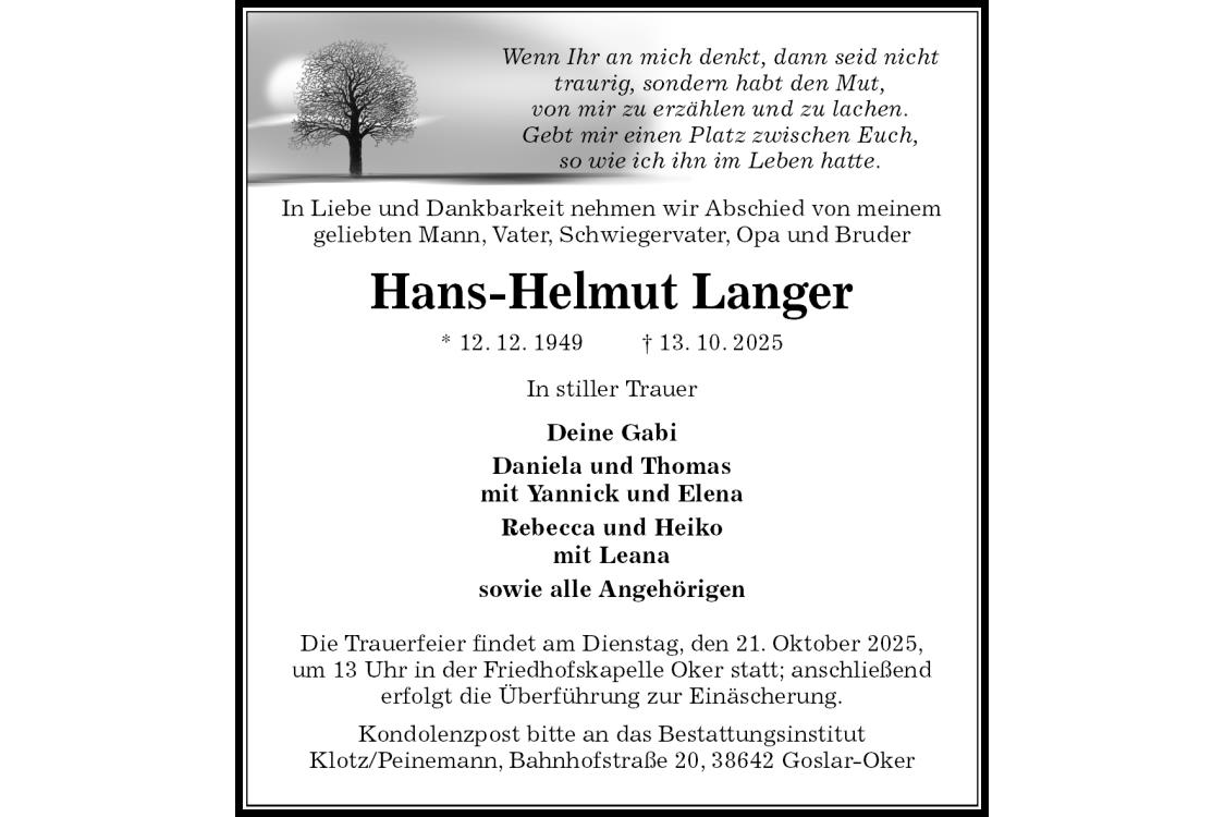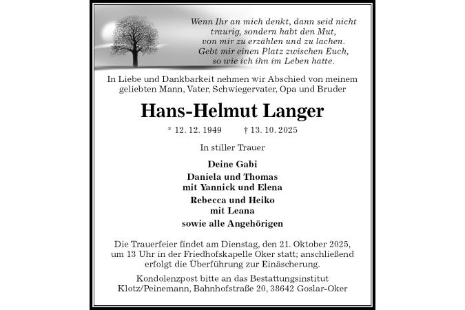 Wenn Ihr an mich denkt, dann seid nicht traurig, sondern habt den Mut,von mir zu erzählen und zu lachen.Gebt mir einen Platz zwischen Euch,so wie ich ihn im Leben hatte. In Liebe und Dankbarkeit nehmen wir Abschied von meinem geliebten Mann, Vater, Schwiegervater, Opa und Bruder Hans-Helmut Langer * 12. 12. 1949 † 13. 10. 2025In stiller Trauer Deine Gabi Daniela und Thomas mit Yannick und Elena Rebecca und Heiko mit Leana sowie alle Angehörigen Die Trauerfeier findet am Dienstag, den 21. Oktober 2025,um 13 Uhr in der Friedhofskapelle Oker statt; anschließend erfolgt die Überführung zur Einäscherung.Kondolenzpost bitte an das BestattungsinstitutKlotz/Peinemann, Bahnhofstraße 20, 38642 Goslar-Oker
