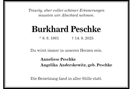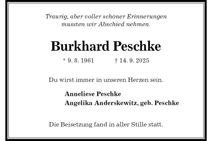 Traurig, aber voller schöner Erinnerungenmussten wir Abschied nehmen. Burkhard Peschke * 9. 8. 1961† 14. 9. 2025Du wirst immer in unseren Herzen sein. Anneliese Peschke Angelika Anderskewitz, geb. Peschke Die Beisetzung fand in aller Stille statt.
