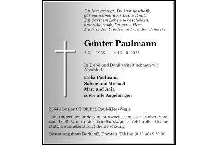 Du hast gesorgt, Du hast geschafft, gar manchmal über Deine Kraft. Du warst im Leben so bescheiden, nun ruhe sanft, Du gutes Herz. Du hast den Frieden und wir den Schmerz. Günter Paulmann * 6. 1. 1936† 16. 10. 2025In Liebe und Dankbarkeit nehmen wir Abschied. Erika Paulmann Sabine und Michael Marc und Anja sowie alle Angehörigen 38642 Goslar OT Ohlhof, Paul-Klee-Weg 4 Die Trauerfeier findet am Mittwoch, dem 22. Oktober 2025, um 13.00 Uhr in der Friedhofskapelle Feldstraße, Goslar, statt; anschließend folgt die Beisetzung. Bestattungshaus Berkhoff, Dörnten, Telefon (0 53 46) 9 50 30