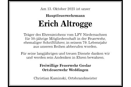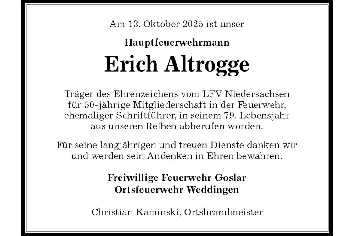 Hauptfeuerwehrmann Erich Altrogge Träger des Ehrenzeichens vom LFV Niedersachsenfür 50-jährige Mitgliederschaft in der Feuerwehr,ehemaliger Schriftführer, in seinem 79. Lebensjahraus unseren Reihen abberufen worden. Für seine langjährigen und treuen Dienste danken wirund werden sein Andenken in Ehren bewahren. Freiwillige Feuerwehr GoslarOrtsfeuerwehr WeddingenChristian Kaminski, OrtsbrandmeisterAm 13. Oktober 2025 ist unser