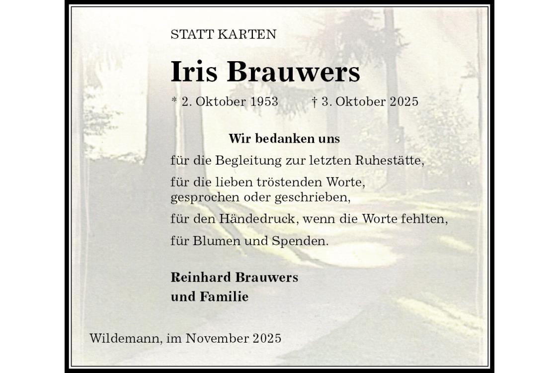 Iris Brauwers * 2. Oktober 1953 † 3. Oktober 2025 Reinhard Brauwers und Familie Wildemann, im November 2025STATT KARTEN Wir bedanken unsfür die Begleitung zur letzten Ruhestätte,für die lieben tröstenden Worte, gesprochen oder geschrieben,für den Händedruck, wenn die Worte fehlten,für Blumen und Spenden.