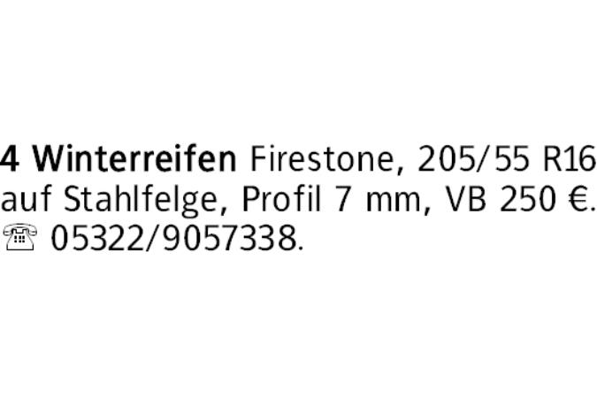 4 Winterreifen Firestone, 205/55 R16 auf Stahlfelge, Profil 7 mm, VB 250 €. 05322/9057338.