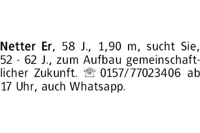 Netter Er, 58 J., 1,90 m, sucht Sie, 52 - 62 J., zum Aufbau gemeinschaftlicher Zukunft. 0157/77023406 ab 17 Uhr, auch Whatsapp.
