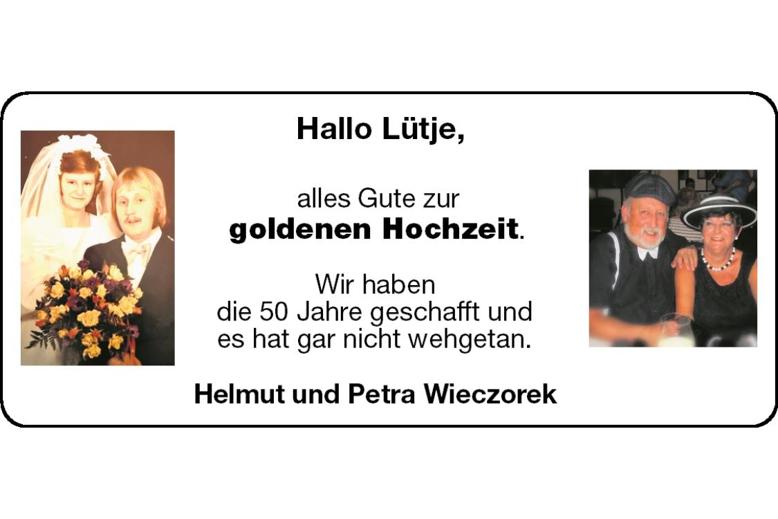 Hallo Lütje, Helmut und Petra Wieczorek alles Gute zur goldenen Hochzeit. Wir haben die 50 Jahre geschafft und es hat gar nicht wehgetan.