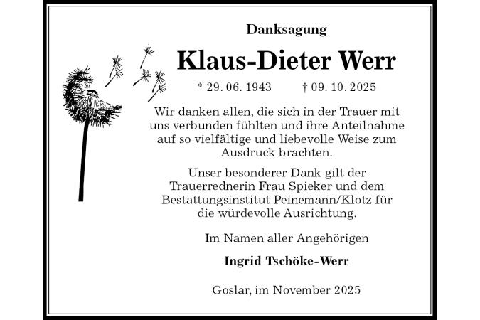 DanksagungWir danken allen, die sich in der Trauer mituns verbunden fühlten und ihre Anteilnahme auf so vielfältige und liebevolle Weise zumAusdruck brachten.Unser besonderer Dank gilt derTrauerrednerin Frau Spieker und demBestattungsinstitut Peinemann/Klotz fürdie würdevolle Ausrichtung. Klaus-Dieter Werr * 29. 06. 1943 † 09. 10. 2025Im Namen aller Angehörigen Ingrid Tschöke-Werr Goslar, im November 2025