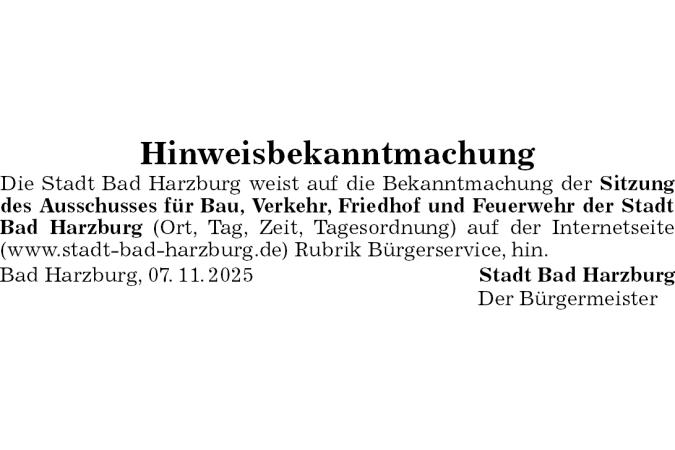Hinweisbekanntmachung Die Stadt Bad Harzburg weist auf die Bekanntmachung der Sitzung des Ausschusses für Bau, Verkehr, Friedhof und Feuerwehr der Stadt Bad Harzburg (Ort, Tag, Zeit, Tagesordnung) auf der Internetseite (www.stadt-bad-harzburg.de) Rubrik Bürgerservice, hin. Bad Harzburg, 07. 11.2025Stadt Bad Harzburg Der Bürgermeister