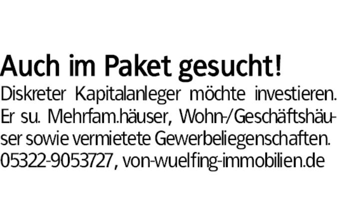 Auch im Paket gesucht! Diskreter Kapitalanleger möchte investieren.Er su. Mehrfam.häuser, Wohn-/Geschäftshäu-ser sowie vermietete Gewerbeliegenschaften. 05322-9053727, von-wuelfing-immobilien.de