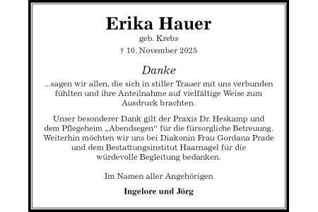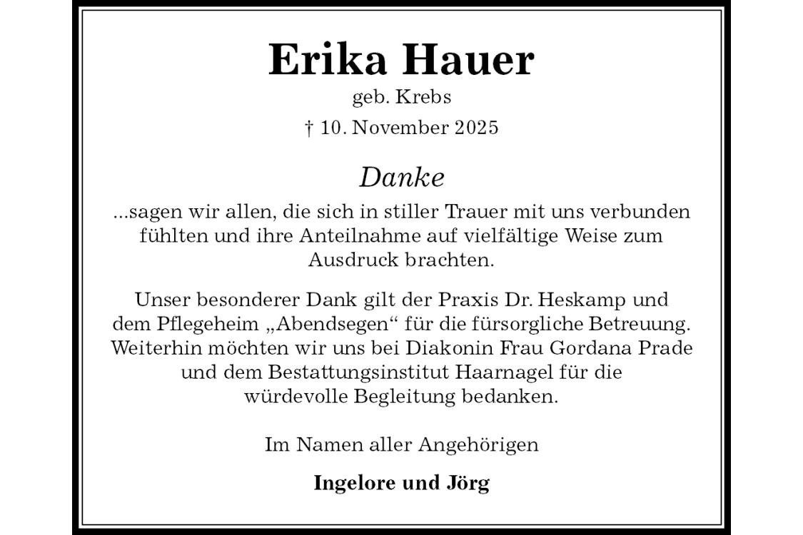 Erika Hauer geb. Krebs † 10. November 2025Im Namen aller Angehörigen Ingelore und Jörg Danke ...sagen wir allen, die sich in stiller Trauer mit uns verbunden fühlten und ihre Anteilnahme auf vielfältige Weise zum Ausdruck brachten. Unser besonderer Dank gilt der Praxis Dr. Heskamp unddem Pflegeheim „Abendsegen“ für die fürsorgliche Betreuung. Weiterhin möchten wir uns bei Diakonin Frau Gordana Prade und dem Bestattungsinstitut Haarnagel für diewürdevolle Begleitung bedanken.