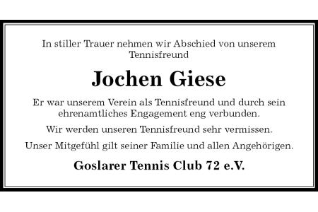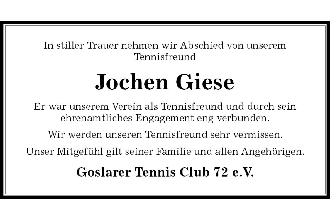 In stiller Trauer nehmen wir Abschied von unserem Tennisfreund Jochen Giese Goslarer Tennis Club 72 e.V.Er war unserem Verein als Tennisfreund und durch sein ehrenamtliches Engagement eng verbunden.Wir werden unseren Tennisfreund sehr vermissen.Unser Mitgefühl gilt seiner Familie und allen Angehörigen.