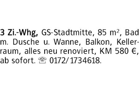 3 Zi.-Whg, GS-Stadtmitte, 85 m², Bad m. Dusche u. Wanne, Balkon, Kellerraum, alles neu renoviert, KM 580 €, ab sofort. 0172/1734618.