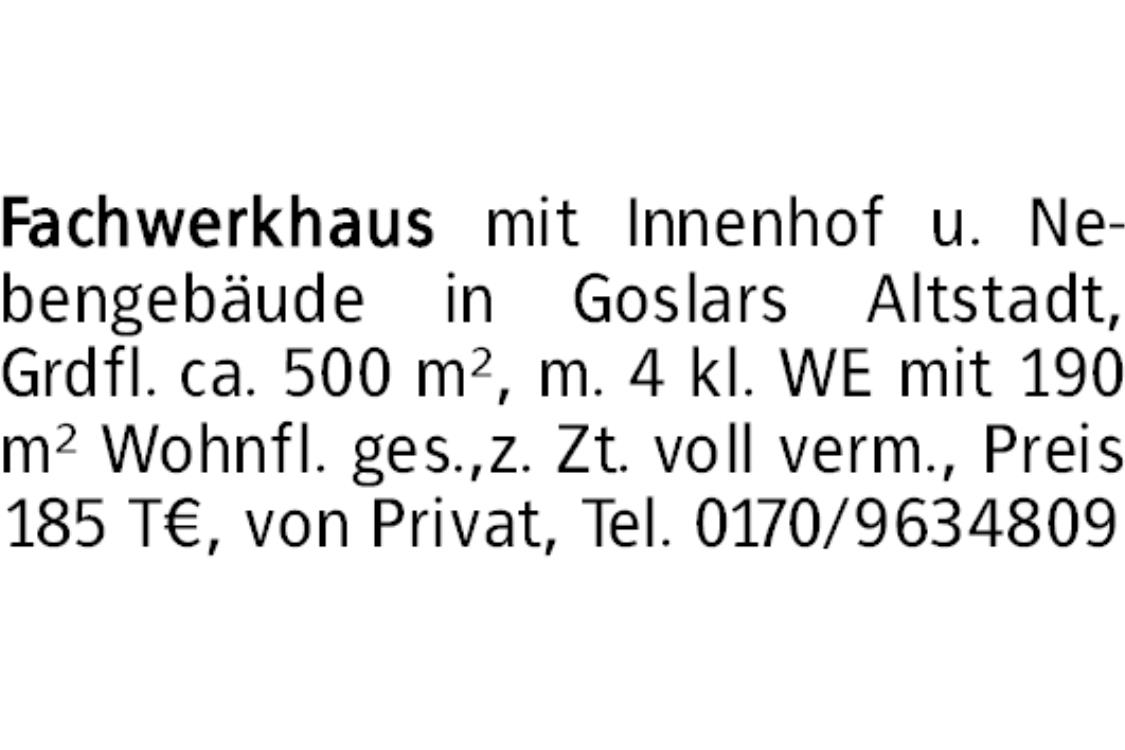 Fachwerkhaus mit Innenhof u. Nebengebäude in Goslars Altstadt, Grdfl. ca. 500 m², m. 4 kl. WE mit 190 m² Wohnfl. ges.,z. Zt. voll verm., Preis 185 T€, von Privat, Tel. 0170/9634809