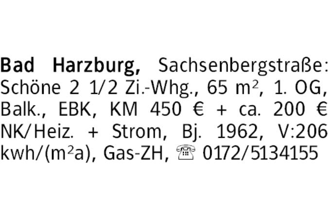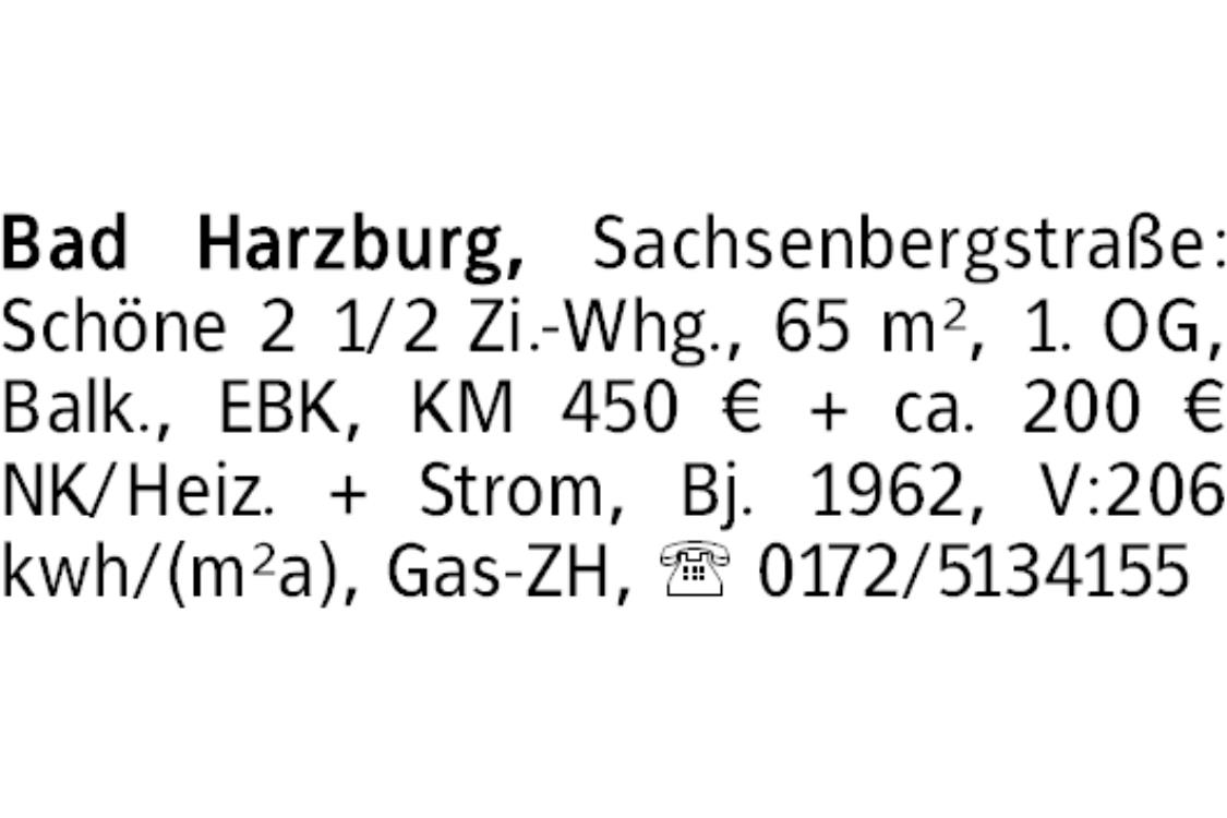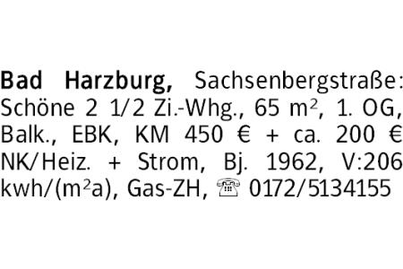 Bad Harzburg, Sachsenbergstraße: Schöne 2 1/2 Zi.-Whg., 65 m², 1. OG, Balk., EBK, KM 450 € + ca. 200 € NK/Heiz. + Strom, Bj. 1962, V:206 kwh/(m²a), Gas-ZH, 0172/5134155