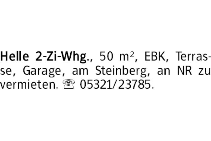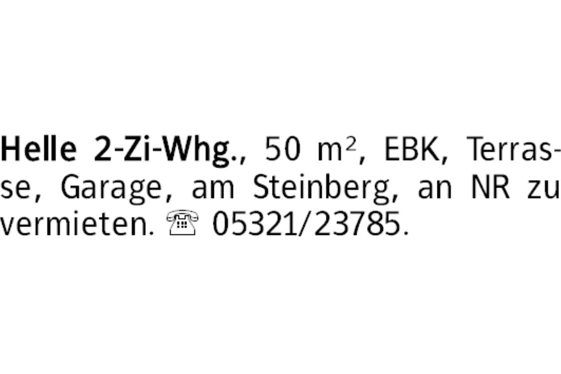 Helle 2-Zi-Whg., 50 m², EBK, Terrasse, Garage, am Steinberg, an NR zu vermieten. 05321/23785.