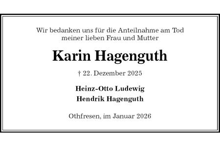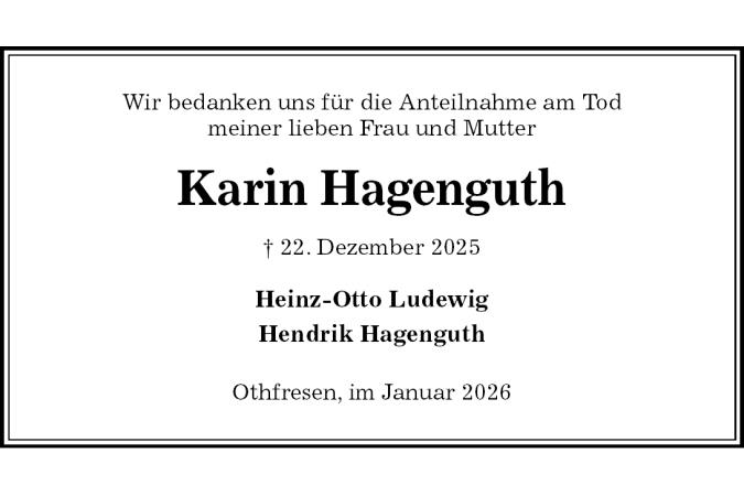 Wir bedanken uns für die Anteilnahme am Todmeiner lieben Frau und MutterKarin Hagenguth† 22. Dezember 2025Heinz-Otto Ludewig Hendrik HagenguthOthfresen, im Januar 2026