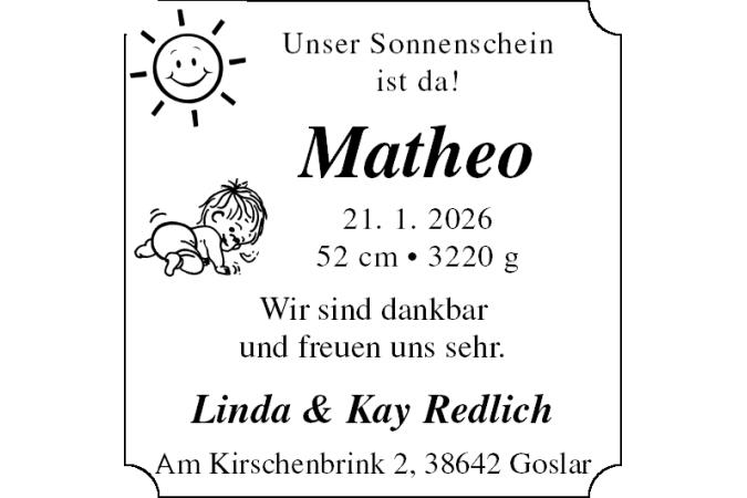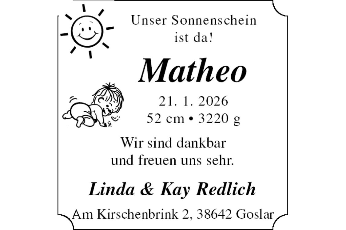 Unser Sonnenscheinist da! Matheo 21. 1. 202652 cm • 3220 g Linda & Kay Redlich Am Kirschenbrink 2, 38642 Goslar Wir sind dankbarund freuen uns sehr.