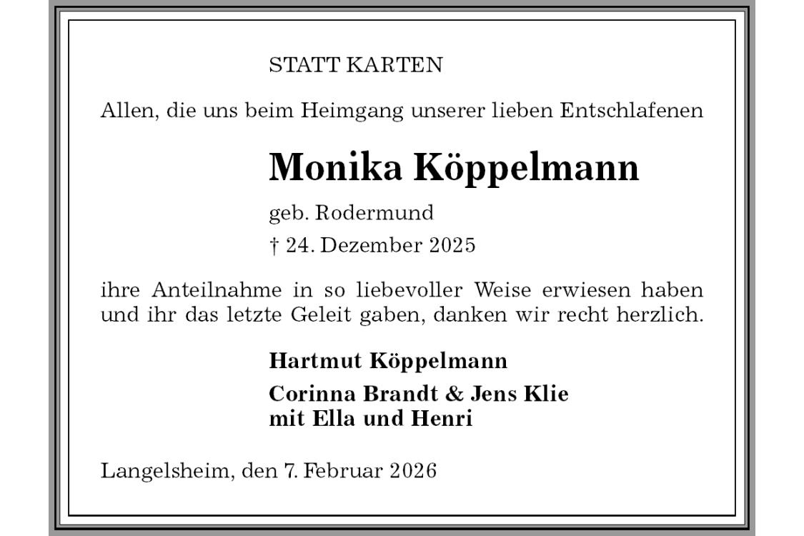 STATT KARTEN Allen, die uns beim Heimgang unserer lieben Entschlafenen Monika Köppelmann† 24. Dezember 2025Hartmut Köppelmann Corinna Brandt & Jens Kliemit Ella und HenriLangelsheim, den 7. Februar 2026geb. Rodermundihre Anteilnahme in so liebevoller Weise erwiesen haben und ihr das letzte Geleit gaben, danken wir recht herzlich.