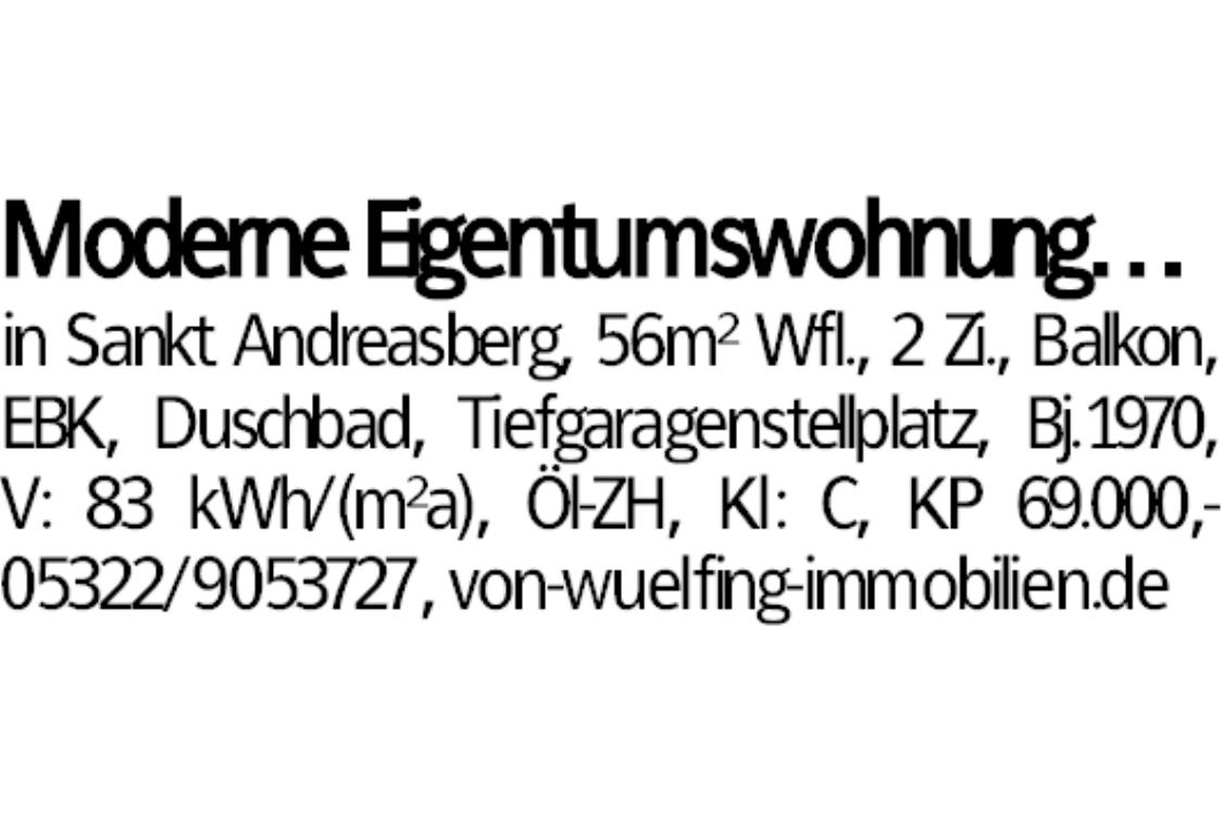 Moderne Eigentumswohnung… in Sankt Andreasberg, 56m² Wfl., 2 Zi., Balkon,EBK, Duschbad, Tiefgaragenstellplatz, Bj.1970,V: 83 kWh/(m²a), Öl-ZH, Kl: C, KP 69.000,-05322/9053727, von-wuelfing-immobilien.de