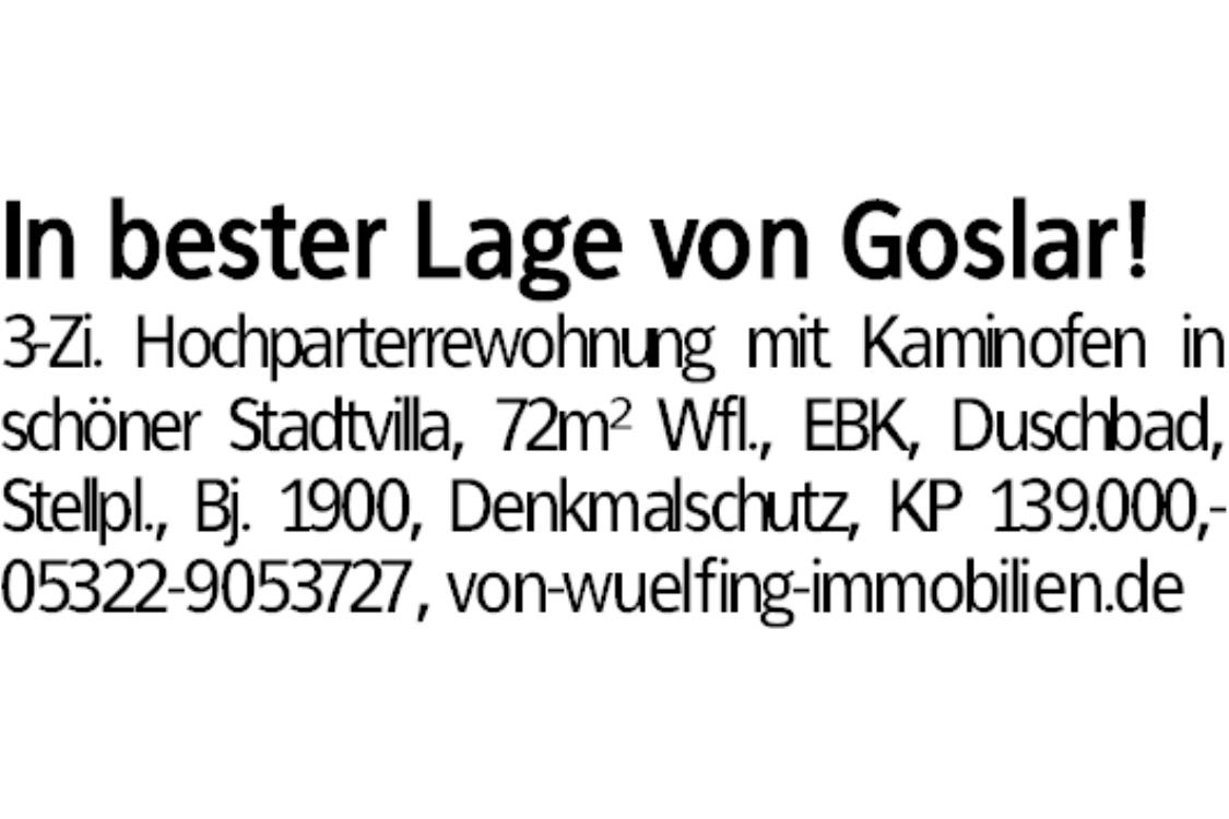 In bester Lage von Goslar! 3-Zi. Hochparterrewohnung mit Kaminofen inschöner Stadtvilla, 72m² Wfl., EBK, Duschbad,Stellpl., Bj. 1900, Denkmalschutz, KP 139.000,-05322-9053727, von-wuelfing-immobilien.de