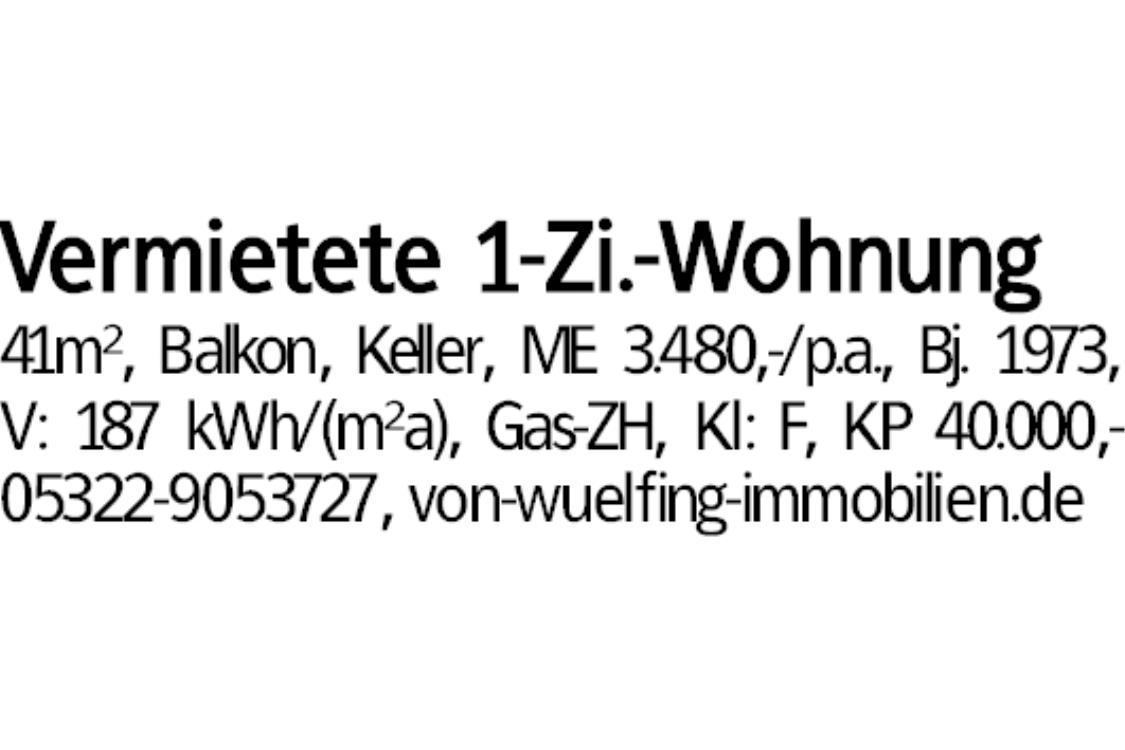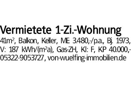 Vermietete 1-Zi.-Wohnung 41m², Balkon, Keller, ME 3.480,-/p.a., Bj. 1973,V: 187 kWh/(m²a), Gas-ZH, Kl: F, KP 40.000,-05322-9053727, von-wuelfing-immobilien.de