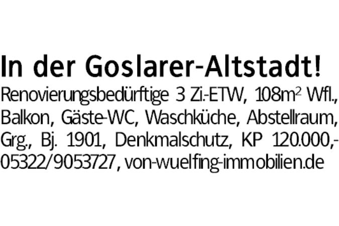 In der Goslarer-Altstadt! Renovierungsbedürftige 3 Zi.-ETW, 108m² Wfl.,Balkon, Gäste-WC, Waschküche, Abstellraum,Grg., Bj. 1901, Denkmalschutz, KP 120.000,-05322/9053727, von-wuelfing-immobilien.de