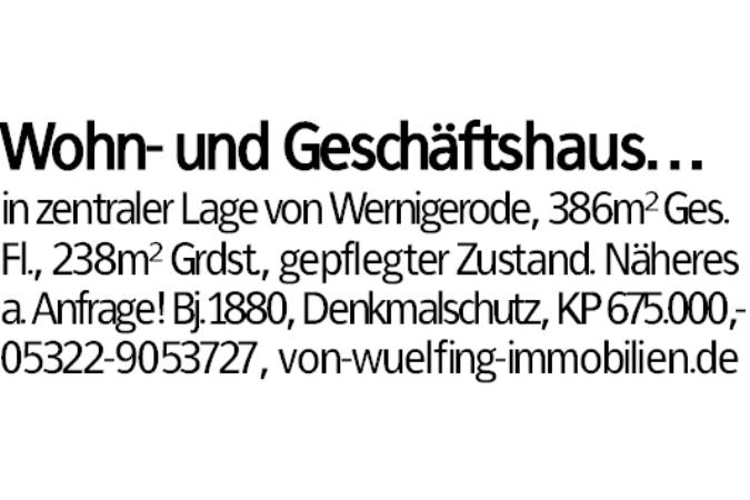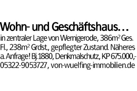 Wohn- und Geschäftshaus… in zentraler Lage von Wernigerode, 386m² Ges. Fl., 238m² Grdst., gepflegter Zustand. Näheres a. Anfrage! Bj.1880, Denkmalschutz, KP 675.000,- 05322-9053727, von-wuelfing-immobilien.de