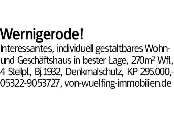Wernigerode! Interessantes, individuell gestaltbares Wohn- und Geschäftshaus in bester Lage, 270m² Wfl.,4 Stellpl., Bj.1932, Denkmalschutz, KP 295.000,-05322-9053727, von-wuelfing-immobilien.de