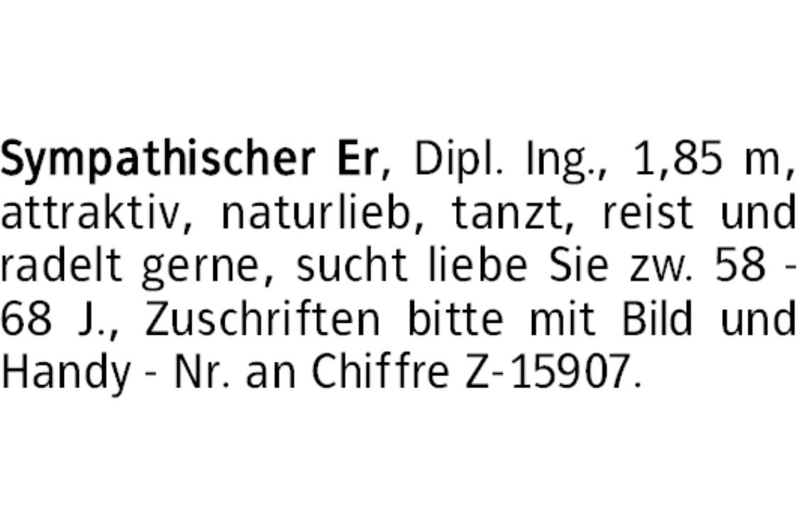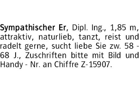 Sympathischer Er, Dipl. Ing., 1,85 m, attraktiv, naturlieb, tanzt, reist und radelt gerne, sucht liebe Sie zw. 58 - 68 J., Zuschriften bitte mit Bild und Handy - Nr. an Chiffre Z-15907.