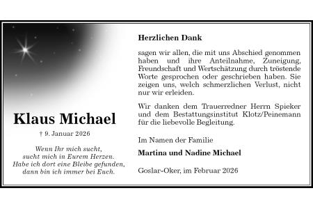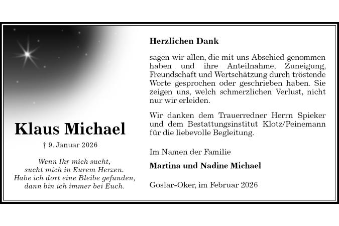 Im Namen der Familie Martina und Nadine Michael Goslar-Oker, im Februar 2026 Herzlichen Dank Klaus Michael † 9. Januar 2026 Wenn Ihr mich sucht, sucht mich in Eurem Herzen. Habe ich dort eine Bleibe gefunden, dann bin ich immer bei Euch. sagen wir allen, die mit uns Abschied genommen haben und ihre Anteilnahme, Zuneigung, Freundschaft und Wertschätzung durch tröstende Worte gesprochen oder geschrieben haben. Sie zeigen uns, welch schmerzlichen Verlust, nicht nur wir erleiden. Wir danken dem Trauerredner Herrn Spieker und dem Bestattungsinstitut Klotz/Peinemann für die liebevolle Begleitung.