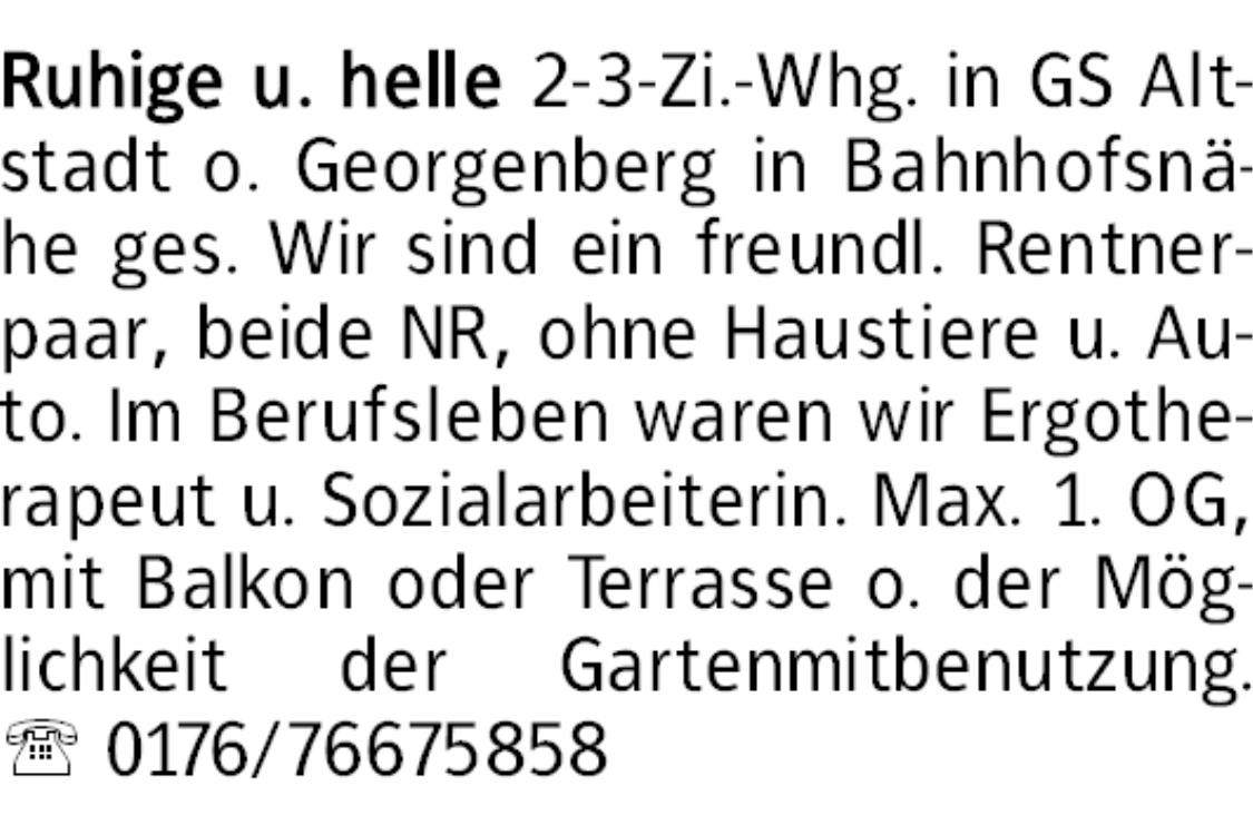 Ruhige u. helle 2-3-Zi.-Whg. in GS Altstadt o. Georgenberg in Bahnhofsnähe ges. Wir sind ein freundl. Rentnerpaar, beide NR, ohne Haustiere u. Auto. Im Berufsleben waren wir Ergotherapeut u. Sozialarbeiterin. Max. 1. OG, mit Balkon oder Terrasse o. der Möglichkeit der Gartenmitbenutzung. 0176/76675858