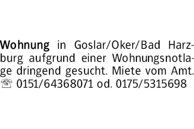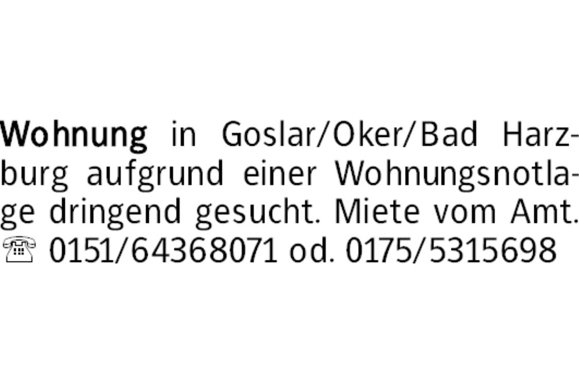 Wohnung in Goslar/Oker/Bad Harzburg aufgrund einer Wohnungsnotlage dringend gesucht. Miete vom Amt. 0151/64368071 od. 0175/5315698