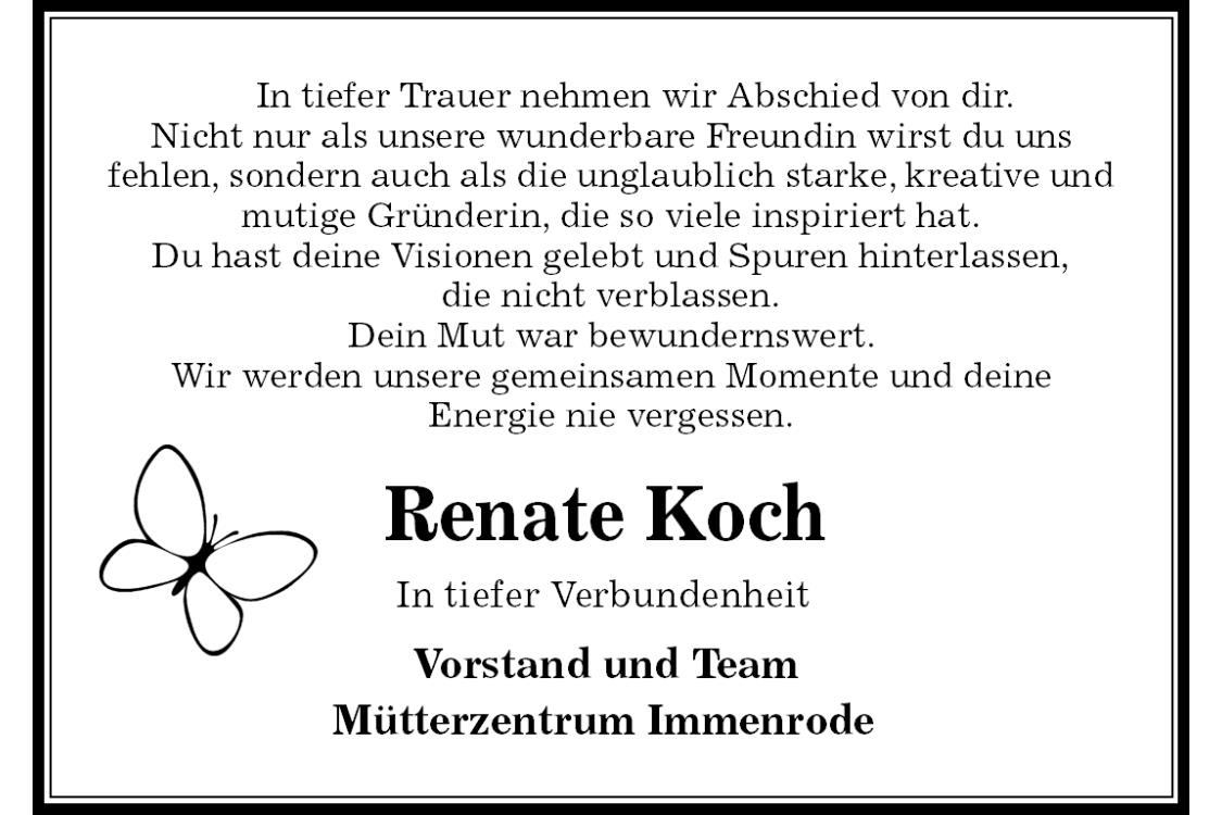 In tiefer Trauer nehmen wir Abschied von dir.Nicht nur als unsere wunderbare Freundin wirst du uns fehlen, sondern auch als die unglaublich starke, kreative und mutige Gründerin, die so viele inspiriert hat.Du hast deine Visionen gelebt und Spuren hinterlassen,die nicht verblassen.Dein Mut war bewundernswert.Wir werden unsere gemeinsamen Momente und deineEnergie nie vergessen. Renate Koch In tiefer Verbundenheit Vorstand und Team Mütterzentrum Immenrode