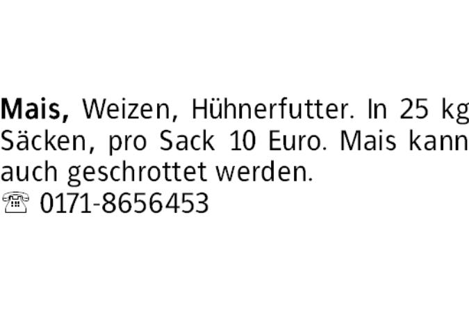 Mais, Weizen, Hühnerfutter. In 25 kg Säcken, pro Sack 10 Euro. Mais kann auch geschrottet werden. 0171-8656453