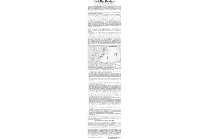 Stadt Bad Harzburg Bebauungsplan Nr. 219 „Auf der Heide“ Erneute und verkürzte Veröffentlichunggemäß § 4 a Abs. 3 Baugesetzbuch (BauGB) Der Rat der Stadt Bad Harzburg hat in seiner Sitzung am 3. März 2026 dem geänderten Entwurf des Bebauungsplanes Nr. 219 „Auf der Heide“ einschl. Begründung und Umweltbericht zugestimmt und die erneute und verkürzte Veröffentlichung gemäß § 4 a Abs. 3 BauGB beschlossen.Neu in dem geänderten Entwurf zur erneuten Veröffentlichung und Trägerbeteiligung ist Folgendes:Aufgrund fehlender Unterlagen sind Nachkartierungen der Feldlerche erforderlich. Dafür wurde ein Hinweis in den Bebauungsplan aufgenommen, der das aktuell geplante Vorgehen verdeutlichen soll. Demnach werden die Kartierungen 2026 wiederholt. Darüber hinaus sind mehrere klarstellende Änderungen in den textlichen Festsetzungen vorgenommen worden. Dies betrifft vorrangig die Nummerierung der textlichen Festsetzungen sowie die textlichen Festsetzung Nr. 2 b und die textlichen Festsetzung Nr. 3. Es wurden klarstellende Änderungen mit Bezug auf die Plangrundlage und den Verweis auf das LGLN vorgenommen, sowie die Verfahrensvermerke aktualisiert. Weiterhin sind ergänzende Informationen zur Entwässerung in die Begründung eingegangen.Es wird bestimmt, dass Stellungnahmen nur zu den geänderten/ergänzten Teilen der Planunterlagen abgegeben werden können. Alle Stellen, die ergänzt bzw. verändert worden sind, sind farbig in rot markiert.Das Plangebiet des Bebauungsplanes befindet sich im Norden des Stadtteils Bündheim östlich der Westeroder Straße. Es setzt sich aus zwei Teilbereichen zusammen, die jeweils in der Flur 1 in der Gemarkung Bündheim liegen. Der westliche Teilbereich umfasst das Flurstück 34/2, 52/22 sowie 35/4 und wird im Westen durch die Westeroder Straße, im Norden durch das Wohngebiet „Carl-Goerdeler-Ring“ und im Süden durch den Friedhof begrenzt. Der östliche Teil des Geltungsbereiches, der für die Anlage eines Regenrückhaltebeckens vorgesehen ist, wird durch Teilflächen des Flurstücks 21/3 gebildet. Dieser grenzt im Osten an einen Wirtschaftsweg. Der genaue Geltungsbereich ist der nachfolgenden Übersichtskarte zu entnehmen.Umweltbezogene Informationen zum Bebauungsplan Nr. 219 „Auf der Heide“ sind in Form des Umweltberichts (Teil der Begründung) und als Fachgutachten zu folgenden Themen verfügbar:• Schutzgut Fläche: Inanspruchnahme bisheriger Wiesen-, Gehölz-und Ackerflächen als künftige Siedlungsflächen • Schutzgut Boden: Inanspruchnahme von landwirtschaftlich genutz-ten, menschlichen Einflüssen ausgesetzten Flächen mit hoher natürlichen Bodenfruchtbarkeit durch teilweise Versiegelung des Bodens infolge von Bebauung; Verlust der natürlichen Bodenfunktionen • Schutzgut Wasser: Beeinflussung des natürlichen Wasserhaushaltesund der Grundwasserneubildung durch teilweise Versiegelung im Plangebiet • Schutzgut Klima und Luft: Geringfügige Senkung der natürlichenVerdunstungsrate der Fläche. Verlust der klimatischen Wirkung der Ackerfläche als Kaltluftproduzent • Schutzgüter Pflanzen und Tiere (einschließlich Arten- und Lebens-gemeinschaften sowie biologische Vielfalt und Artenschutz): Teilweise Beeinträchtigung der Artengruppe der Fledermäuse im Geltungsbereich; Störung angrenzend ansässiger Brutpaare der Feldlerche durch Bauarbeiten; Verlust von potenziellen Habitatstrukturen der Bilche / Haselmäuse; Verlust eines Lebensraums für die Artengruppe der Heuschrecke mit geringer Bedeutung; Umwandlung einer gegenwärtig überwiegend intensiv landwirtschaftlich genutzten Fläche in Wohnbauland; Durch Anlage von Hausgärten im Plangebiet teilweise Aufwertung und Entstehen kleinteiliger und vielfältiger Lebensräume für Pflanzen und Tiere • Schutzgut Landschaft: Umwandlung des Landschaftsbildes zu ei-nem an die Umgebung angepassten Wohngebiet • Schutzgut Mensch und Gesundheit: Lärmbelastung des geplantenWohngebietes durch nahe gelegene Straßenverkehrs- sowie ferner Gewerbeflächen; Entwicklung eines Wohngebietes in ca. 1.500 Metern Entfernung zu einem Störfallbetrieb; Geplante Entwicklung des Baugebietes auf einer Fläche, die harztypische Bodenbelastungen aufweist und dem Bodenplanungsgebiet des Landkreises Goslar zugeordnet werden kann • Schutzgut Kultur – und sonstige Sachgüter: Keine bekannten Aus-wirkungen • Eingriffs- Ausgleichsbilanzierung: Flächenwert des Bestandes:38.393 WE; Flächenwert der Planung: 21.058 WE; Differenz / Defizit: 17.335 WE. Das Defizit der Wertpunkte ist auszugleichen durch Anteile am Kompensationspool „Heinisches Bruch“ • Aussagen zu Wechselbeziehungen und –wirkungen zwischen denSchutzgütern.Gemäß § 4 a Abs. 3 BauGB in Verbindung mit § 3 Abs. 2 BauGB wird der geänderte Entwurf des Bebauungsplanes Nr. 219 „Auf der Heide“ nebst Begründung, Umweltbericht sowie den umweltrelevanten Informationen in der Zeit vom 30. März 2026 bis einschl. 17. April 2026 im Internet unter www.stadt-bad-harzburg.de ¬ Bürgerservice ¬ Beteiligung der Öffentlichkeit sowie über das Internetportal des Landes unter https://uvp.niedersachsen.de/portal/ veröffentlicht.Zusätzlich liegen die Unterlagen während der Öffnungszeiten (montags bis freitags von 7.00 bis 12.00 Uhr sowie donnerstags von 14.00 bis 17.00 Uhr) im Rathaus, Flur III. Obergeschoss öffentlich aus.Während der Dauer der Veröffentlichungs- und Auslegungsfrist können Stellungnahmen vorzugsweise elektronisch an stadtplanung@ stadt-bad-harzburg.de übermittelt werden. Bei Bedarf können diese aber auch schriftlich oder zu Niederschrift bei der Stadt Bad Harzburg, Forstwiese 5, 38667 Bad Harzburg abgegeben werden. Nicht fristgerecht abgegebene Stellungnahmen können bei der Beschlussfassung über den Bebauungsplan unberücksichtigt bleiben.Bad Harzburg, 24. März 2026STADT BAD HARZBURG Der Bürgermeister