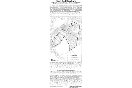 Stadt Bad Harzburg Aufhebung des Bebauungsplanes Nr. 5 „Am Sportplatz Waldhöhe“ Beschleunigtes Verfahren gemäß § 13 a Baugesetzbuch Der Rat der Stadt Bad Harzburg hat in seiner öffentlichen Sitzung am 3. März 2026 beschlossen, das Verfahren zur Aufhebung des Bebauungsplanes Nr. 5 „Am Sportplatz Waldhöhe“ und der Aufhebung der Ortssatzung über besondere Anforderungen an die Bauleitplanung im Baugebiet (Gestaltungssatzung) einzuleiten. Das Verfahren wird im beschleunigten Verfahren gemäß § 13 a Baugesetzbuch durchgeführt, in dem von einer Umweltprüfung abgesehen wird.Das Plangebiet des Bebauungsplanes befindet sich südlich der Ilsenburger Straße und nordöstlich der Stübchentalstraße. Der genaue Geltungsbereich ist der nachfolgenden Übersichtskarte zu entnehmen.Der Rat der Stadt Bad Harzburg hat dem Entwurf der Aufhebung des Bebauungsplanes Nr. 5 „Am Sportplatz Waldhöhe“ und der Aufhebung der Ortssatzung über besondere Anforderungen an die Bauleitplanung im Baugebiet (Gestaltungssatzung) zugestimmt und beschlossen, die Öffentlichkeit gemäß § 3 Abs. 2 Baugesetzbuch zu beteiligen. Die Planunterlagen einschl. der Begründung werden in der Zeit vom 30. März 2026 bis einschl. 5. Mai 2026 im Internet unter www.stadt-bad-harzburg.de ¬ Bürgerservice ¬ Beteiligung der Öffentlichkeit sowie über das Internetportal des Landes unter https://uvp.niedersachsen.de/portal/ veröffentlicht.Zusätzlich liegen die Unterlagen während der Öffnungszeiten (montags bis freitags von 7.00 bis 12.00 Uhr sowie donnerstags von 14.00 bis 17.00 Uhr) im Rathaus, Flur III. Obergeschoss öffentlich aus.Während der Dauer der Veröffentlichungsfrist können Stellungnahmen vorzugsweise elektronisch an Stadtplanung@stadt-bad-harzburg.de übermittelt werden. Bei Bedarf können diese aber auch schriftlich oder zu Niederschrift bei der Stadt Bad Harzburg, Forstwiese 5, 38667 Bad Harzburg abgegeben werden. Nicht fristgerecht abgegebene Stellungnahmen können bei der Beschlussfassung über den Bebauungsplan unberücksichtigt bleiben.Bad Harzburg, 23. März 2026STADT BAD HARZBURG Der Bürgermeister