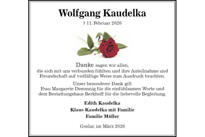 Wolfgang Kaudelka† 11. Februar 2026Edith KaudelkaKlaus Kaudelka mit FamilieFamilie Müller Goslar, im März 2026 Danke sagen wir allen,die sich mit uns verbunden fühlten und ihre Anteilnahme und Freundschaft auf vielfältige Weise zum Ausdruck brachten.Unser besonderer Dank giltFrau Margarete Demmnig für die einfühlsamen Worte und dem Bestattungshaus Berkhoff für die liebevolle Begleitung.