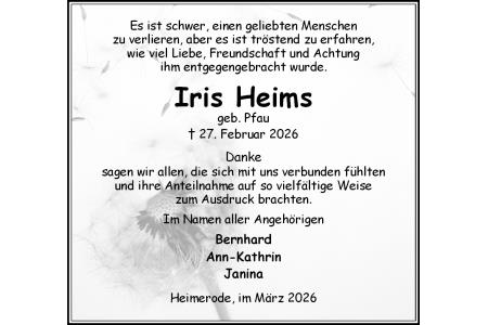 Es ist schwer, einen geliebten Menschenzu verlieren, aber es ist tröstend zu erfahren,wie viel Liebe, Freundschaft und Achtungihm entgegengebracht wurde. Iris Heims † 27. Februar 2026 Im Namen aller Angehörigen Bernhard Ann-KathrinJanina Heimerode, im März 2026 geb. Pfau Danke sagen wir allen, die sich mit uns verbunden fühltenund ihre Anteilnahme auf so vielfältige Weisezum Ausdruck brachten.