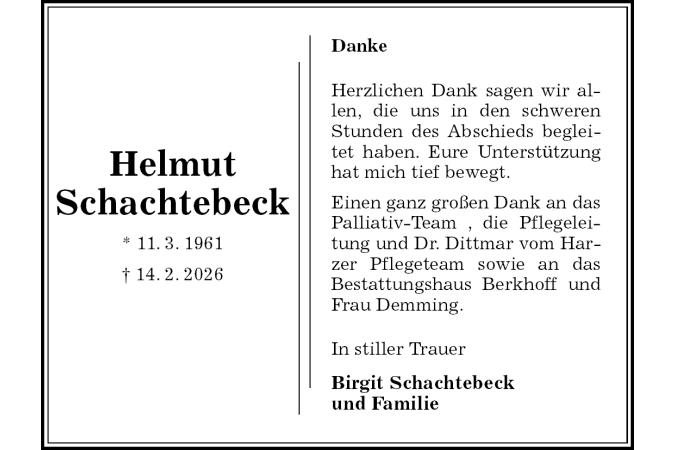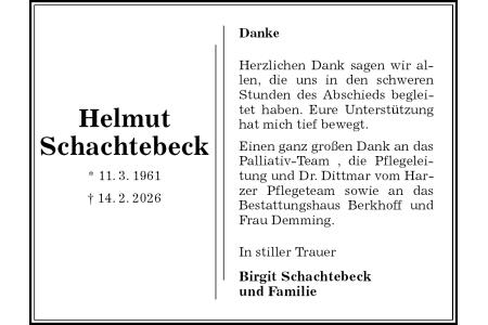 Danke In stiller Trauer Birgit Schachtebeckund Familie Helmut Schachtebeck * 11. 3. 1961† 14. 2. 2026 Herzlichen Dank sagen wir allen, die uns in den schweren Stunden des Abschieds begleitet haben. Eure Unterstützung hat mich tief bewegt.Einen ganz großen Dank an das Palliativ-Team , die Pflegeleitung und Dr. Dittmar vom Harzer Pflegeteam sowie an das Bestattungshaus Berkhoff und Frau Demming.