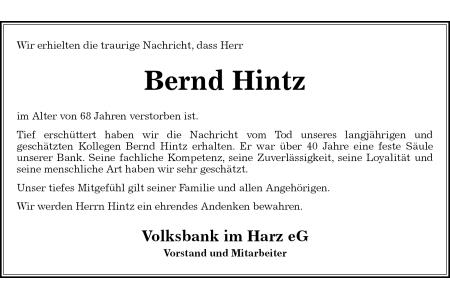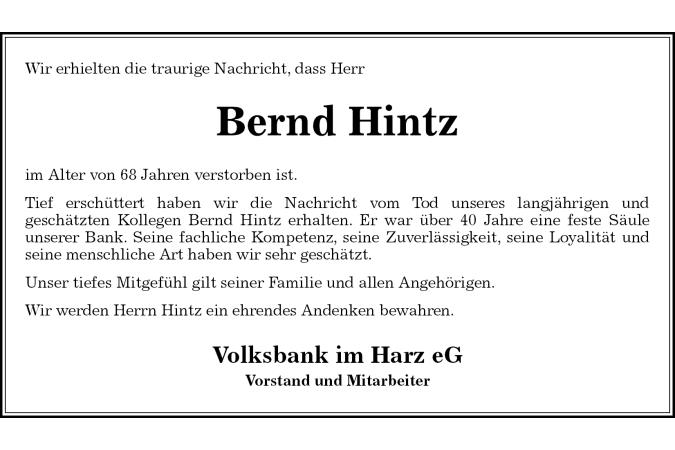 Wir erhielten die traurige Nachricht, dass Herr Bernd Hintz Volksbank im Harz eG Vorstand und Mitarbeiterim Alter von 68 Jahren verstorben ist. Tief erschüttert haben wir die Nachricht vom Tod unseres langjährigen und geschätzten Kollegen Bernd Hintz erhalten. Er war über 40 Jahre eine feste Säule unserer Bank. Seine fachliche Kompetenz, seine Zuverlässigkeit, seine Loyalität und seine menschliche Art haben wir sehr geschätzt. Unser tiefes Mitgefühl gilt seiner Familie und allen Angehörigen. Wir werden Herrn Hintz ein ehrendes Andenken bewahren.