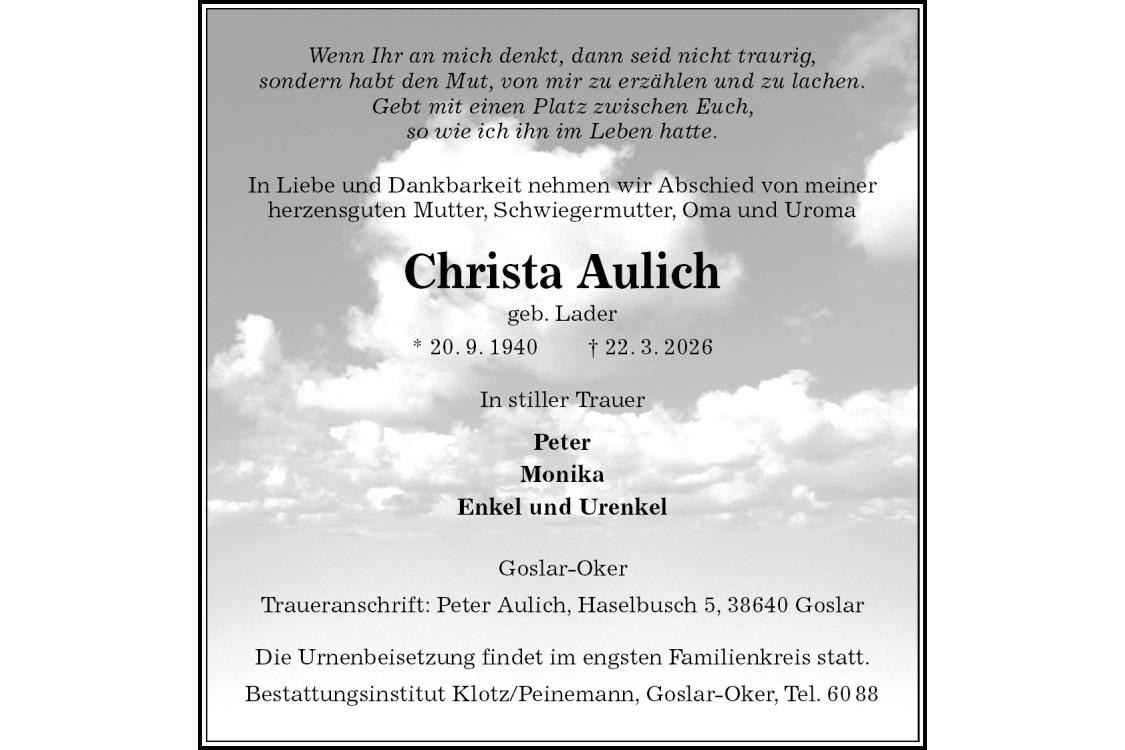 Wenn Ihr an mich denkt, dann seid nicht traurig,sondern habt den Mut, von mir zu erzählen und zu lachen. Gebt mit einen Platz zwischen Euch, so wie ich ihn im Leben hatte. In Liebe und Dankbarkeit nehmen wir Abschied von meiner herzensguten Mutter, Schwiegermutter, Oma und Uroma Christa Aulich geb. Lader * 20. 9. 1940† 22. 3. 2026In stiller Trauer Peter Monika Enkel und Urenkel Goslar-OkerTraueranschrift: Peter Aulich, Haselbusch 5, 38640 Goslar Die Urnenbeisetzung findet im engsten Familienkreis statt.Bestattungsinstitut Klotz/Peinemann, Goslar-Oker, Tel. 6088