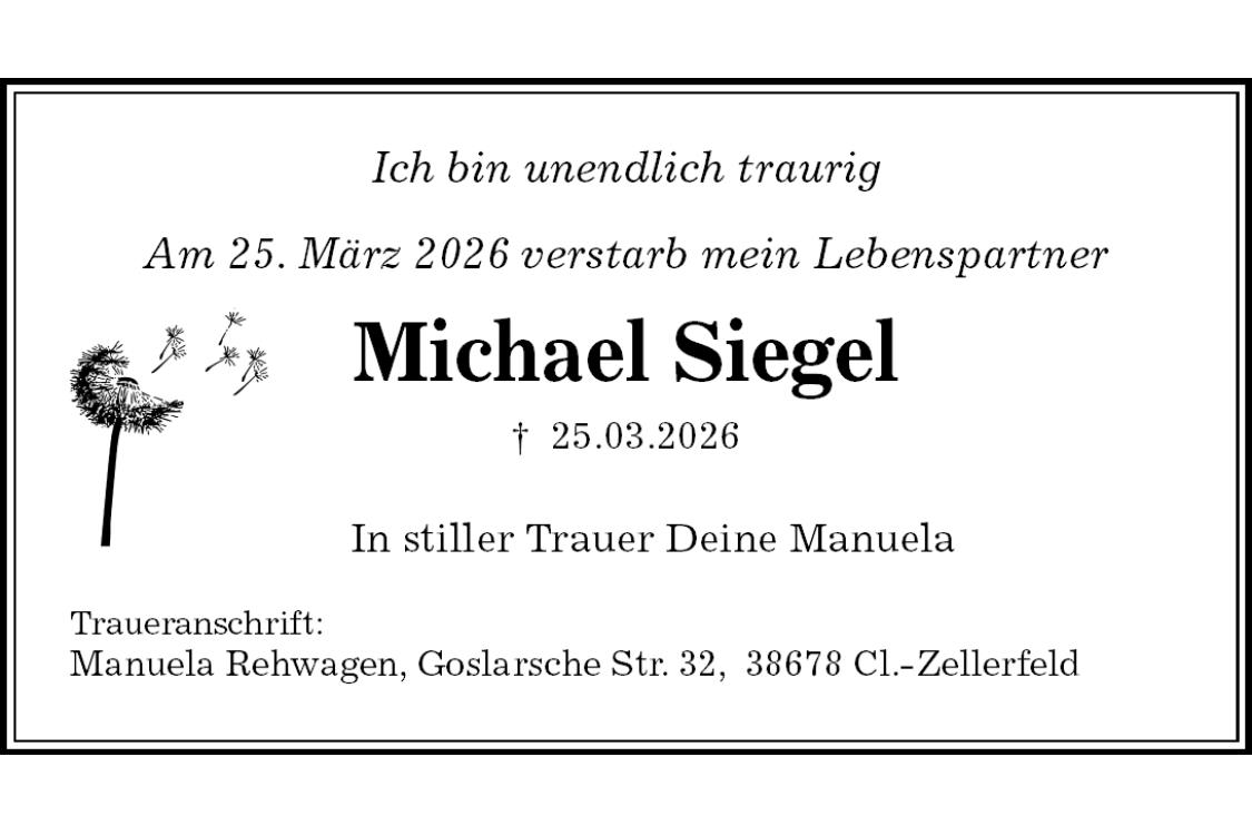 Ich bin unendlich traurigAm 25. März 2026 verstarb mein Lebenspartner Michael Siegel †25.03.2026 In stiller Trauer Deine ManuelaTraueranschrift:Manuela Rehwagen, Goslarsche Str. 32, 38678 Cl.-Zellerfeld