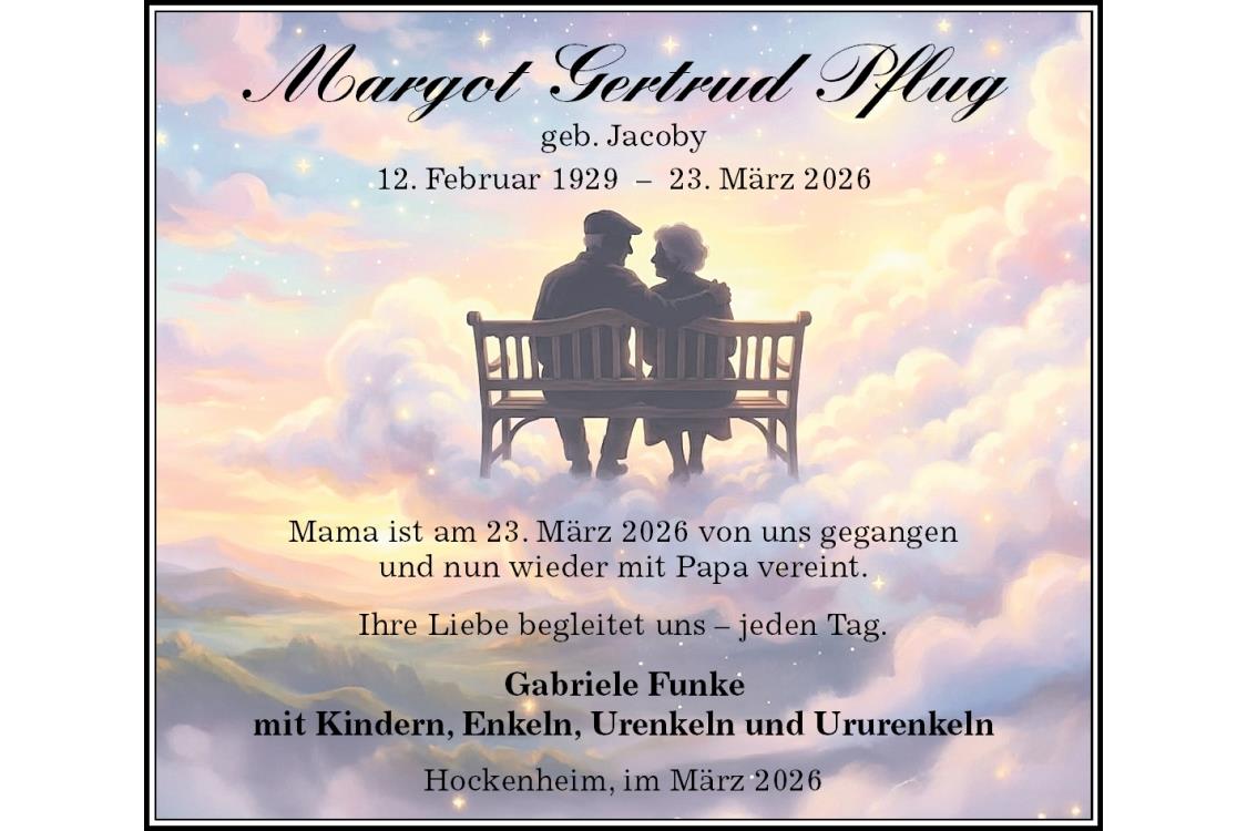 Margot Gertrud Pflug geb. Jacoby 12. Februar 1929 – 23. März 2026 Gabriele Funkemit Kindern, Enkeln, Urenkeln und Ururenkeln Hockenheim, im März 2026 Mama ist am 23. März 2026 von uns gegangenund nun wieder mit Papa vereint. Ihre Liebe begleitet uns – jeden Tag.