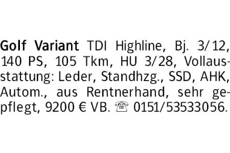 Golf Variant TDI Highline, Bj. 3/12, 140 PS, 105 Tkm, HU 3/28, Vollausstattung: Leder, Standhzg., SSD, AHK, Autom., aus Rentnerhand, sehr gepflegt, 9200 € VB. 0151/53533056.